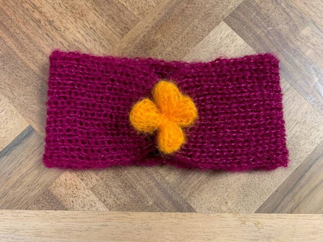 Bandeau enfant tricoté en côtes 1/1 agrémenté d'une petite fleur en tricot.