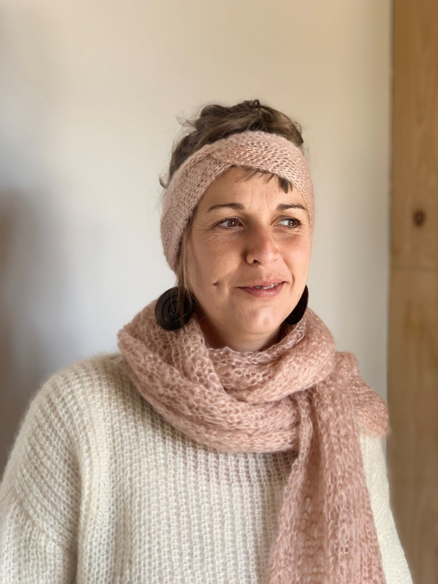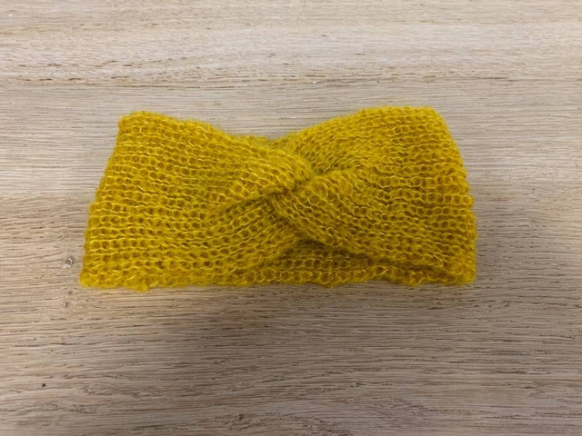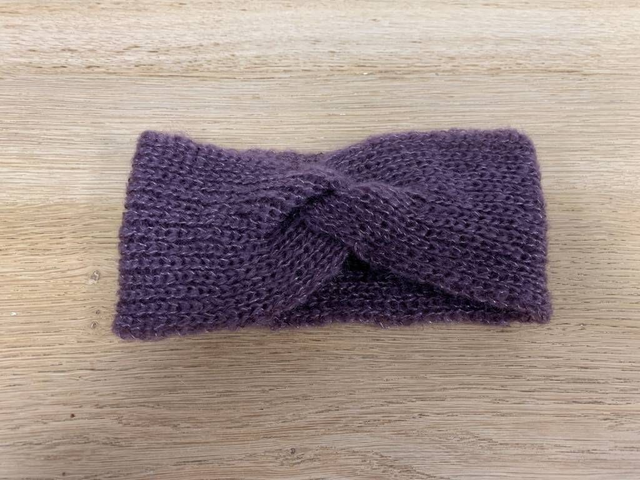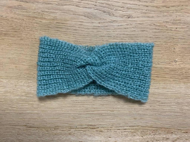 Bandeau cache oreille tricoté en côtes 1/1 avec motif torsadé.