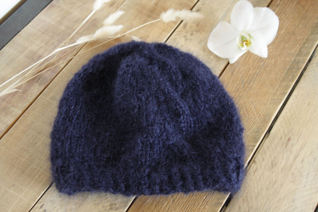 Bonnet tricoté main avec un motif torsadé sur le côté.