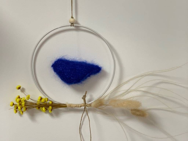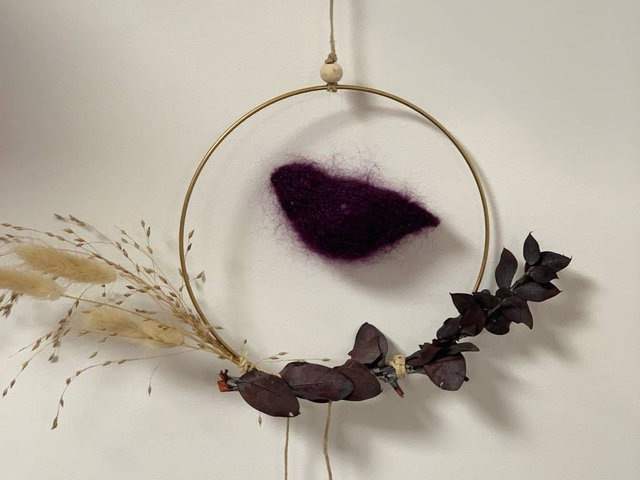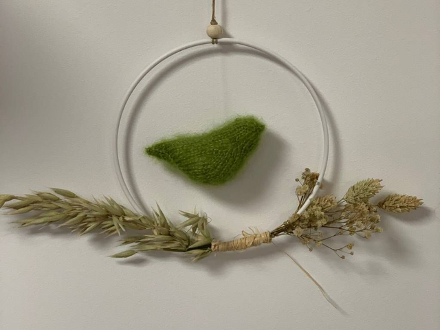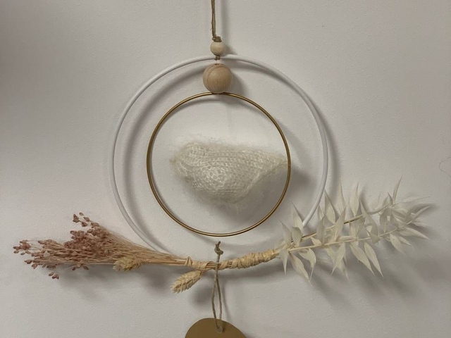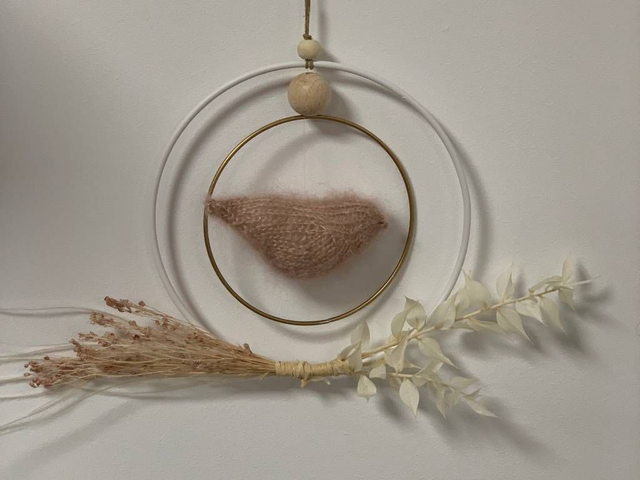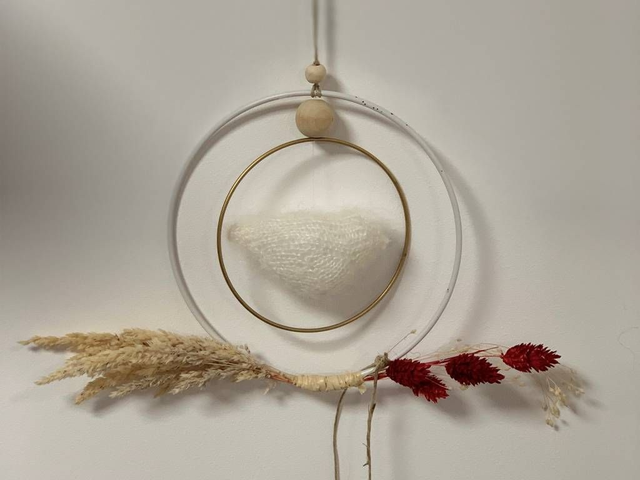 Suspension murale avec couronne en anneau métallique doré ou blanc de 15cm de diamètre, agrémenté de fleurs séchées dans les tons naturels. Oiseau tricoté main en mohair et soie.