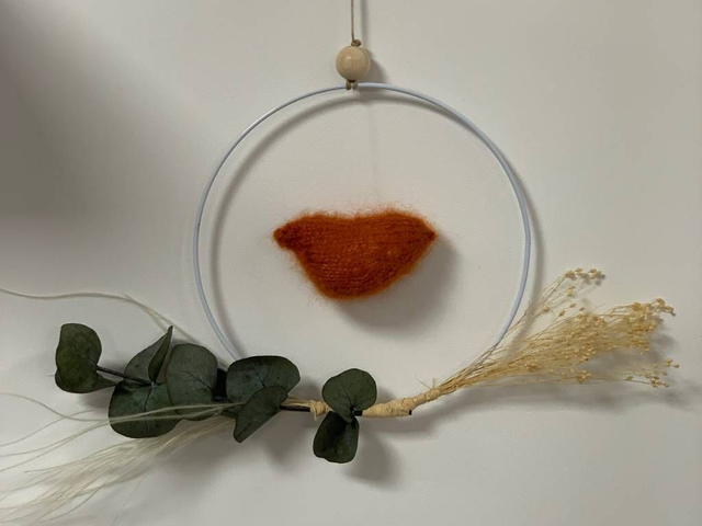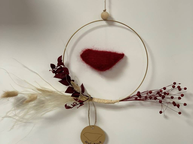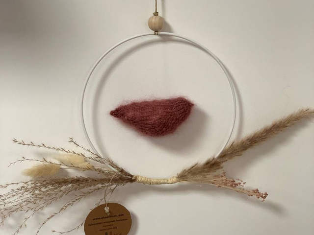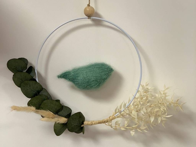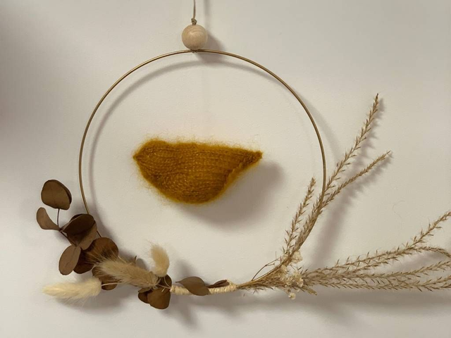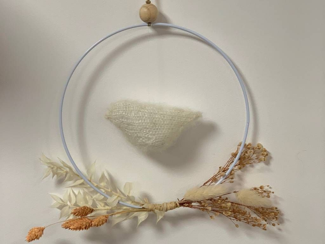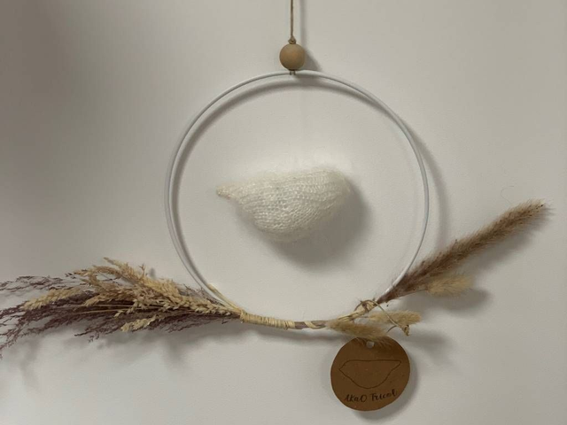 Suspension murale avec couronne en anneau métallique doré ou blanc de 20cm de diamètre, agrémenté de fleurs séchées dans les tons naturels. Oiseau tricoté main en mohair et soie.