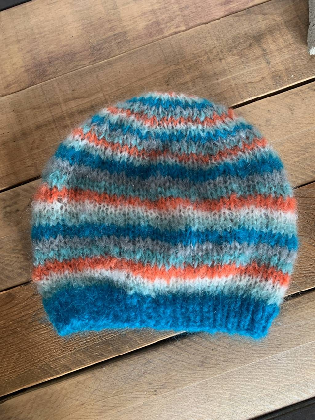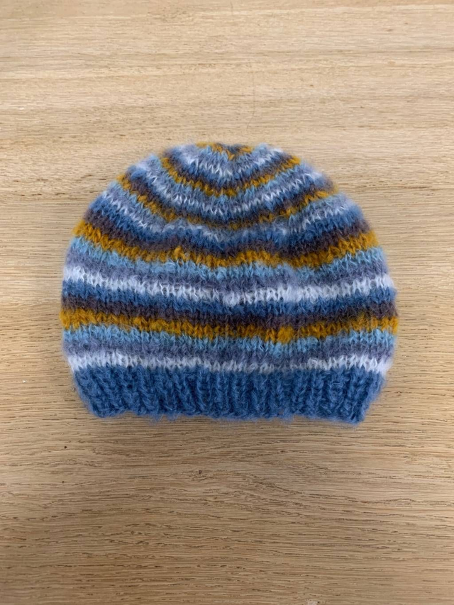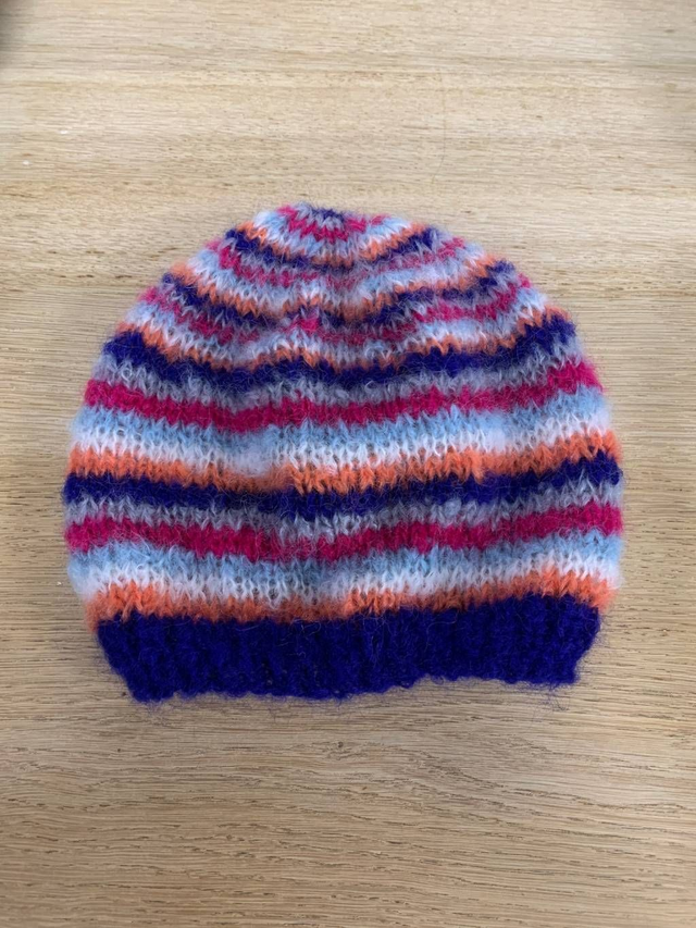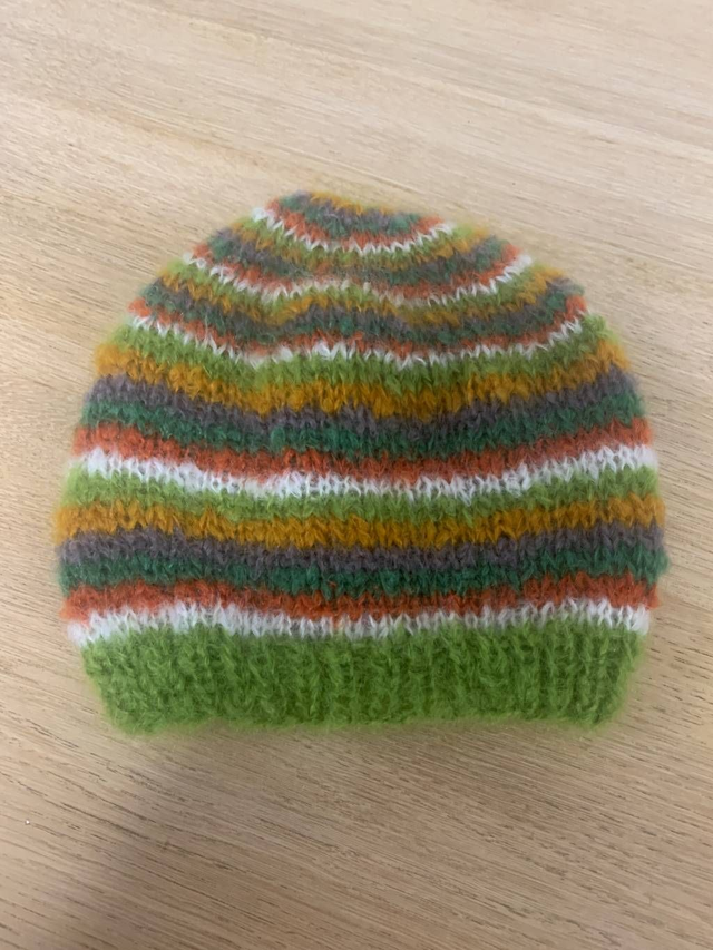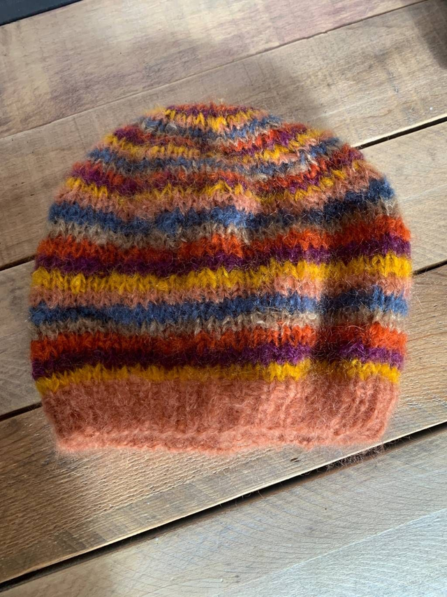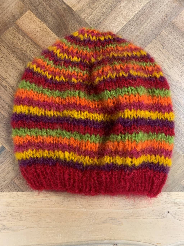 Bonnet tricoté main avec un motif à rayure multicolore.